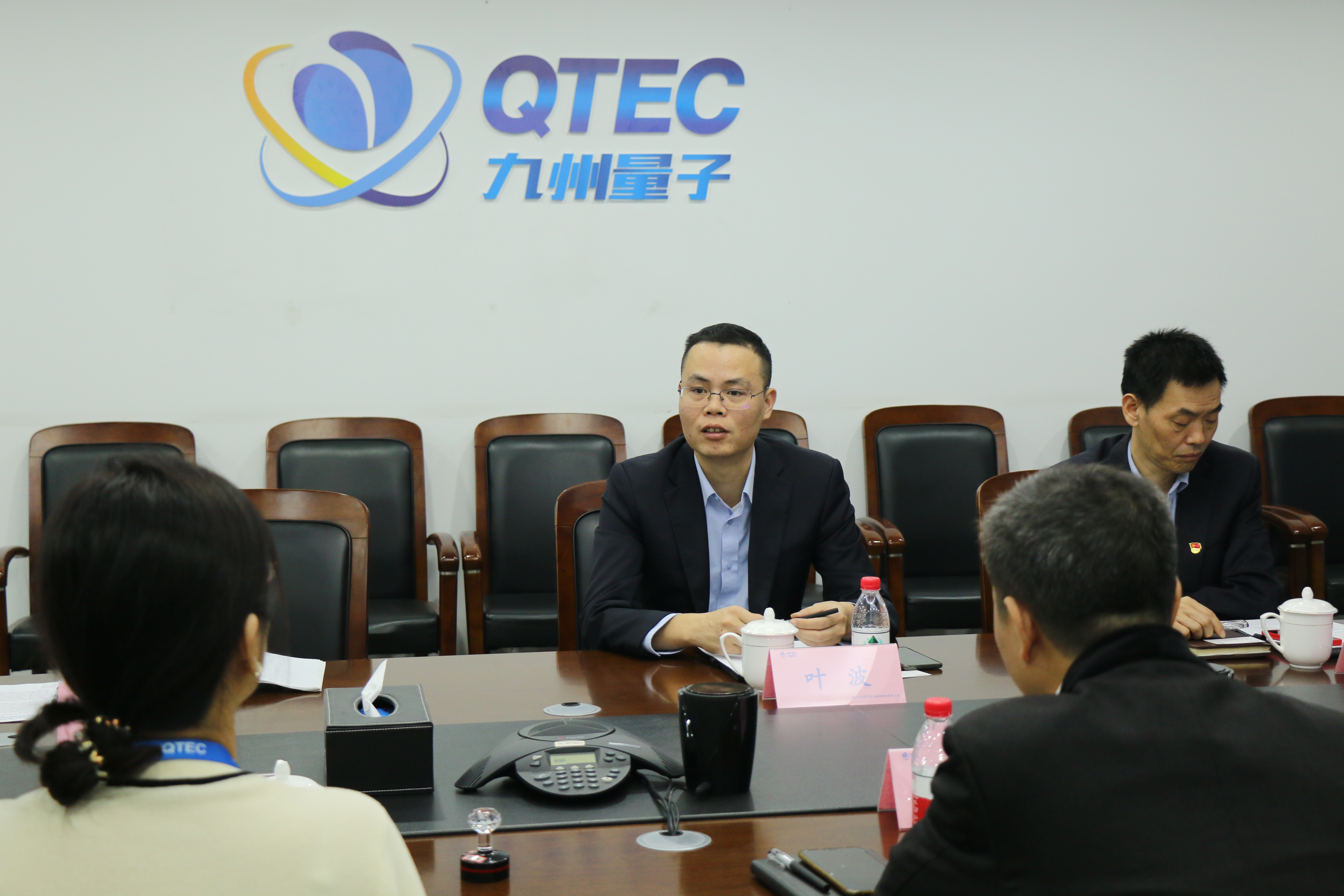 圖為中移鐵通杭州分公司領(lǐng)導(dǎo)參觀九州量子科技展廳