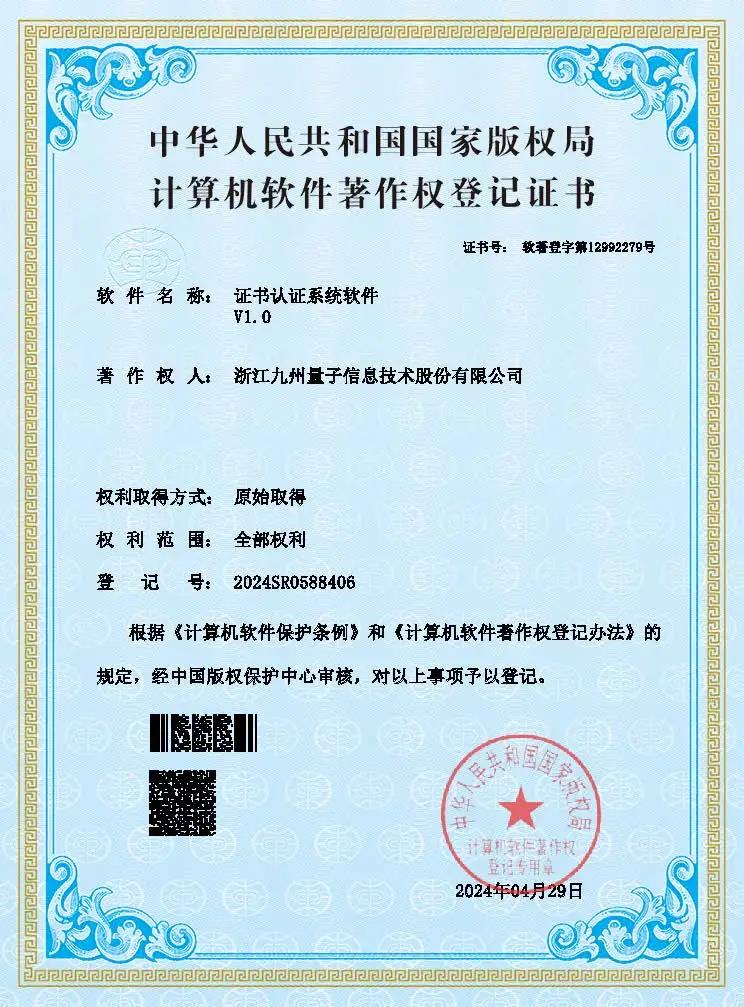 近日,經(jīng)過(guò)申報(bào)、受理、審核等多重環(huán)節(jié),由浙江九州量子研發(fā)的產(chǎn)品軟著“數(shù)字證書(shū)認(rèn)證系統(tǒng)”通過(guò)審批,正式獲得由國(guó)家版權(quán)局頒發(fā)的計(jì)算機(jī)軟件著作權(quán)登記證書(shū)。這一成果標(biāo)志著公司的數(shù)字化自主研發(fā)能力和創(chuàng)新能力在具有獨(dú)立知識(shí)產(chǎn)權(quán)的軟件開(kāi)發(fā)領(lǐng)域得到了權(quán)威認(rèn)證和充分肯定。